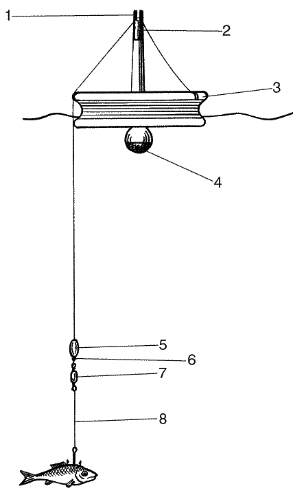 7 — вертлюжок; 8 – поводок(тройник 2) 9 ― леска (намотка 15 м.)